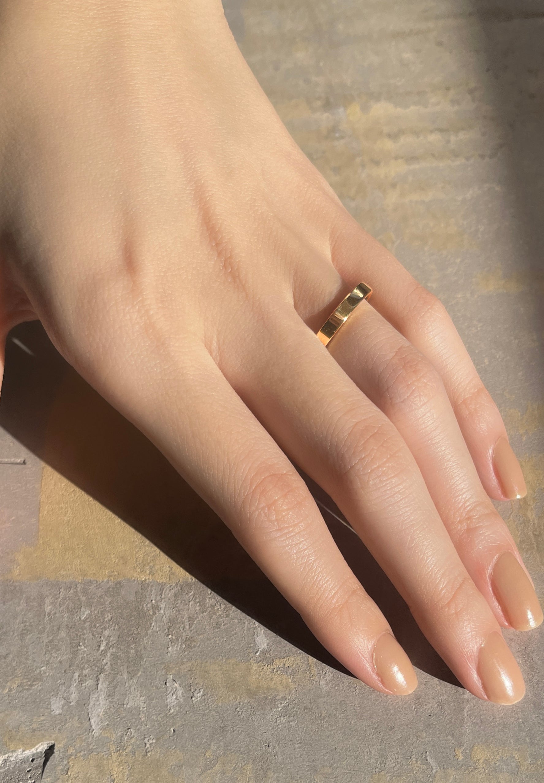 HIDDEN PLACE는 결혼반지와 호환되는 아이템입니다. 겉면은 구름 한 점 없이 아름답고 평평한 표면이고, 안쪽은 완만하게 둥글게 처리되어 있어 착용하기 매우 편안한 반지입니다. 외부와 내부의 대비가 아름다운 디자인으로 차분한 분위기를 연출합니다.