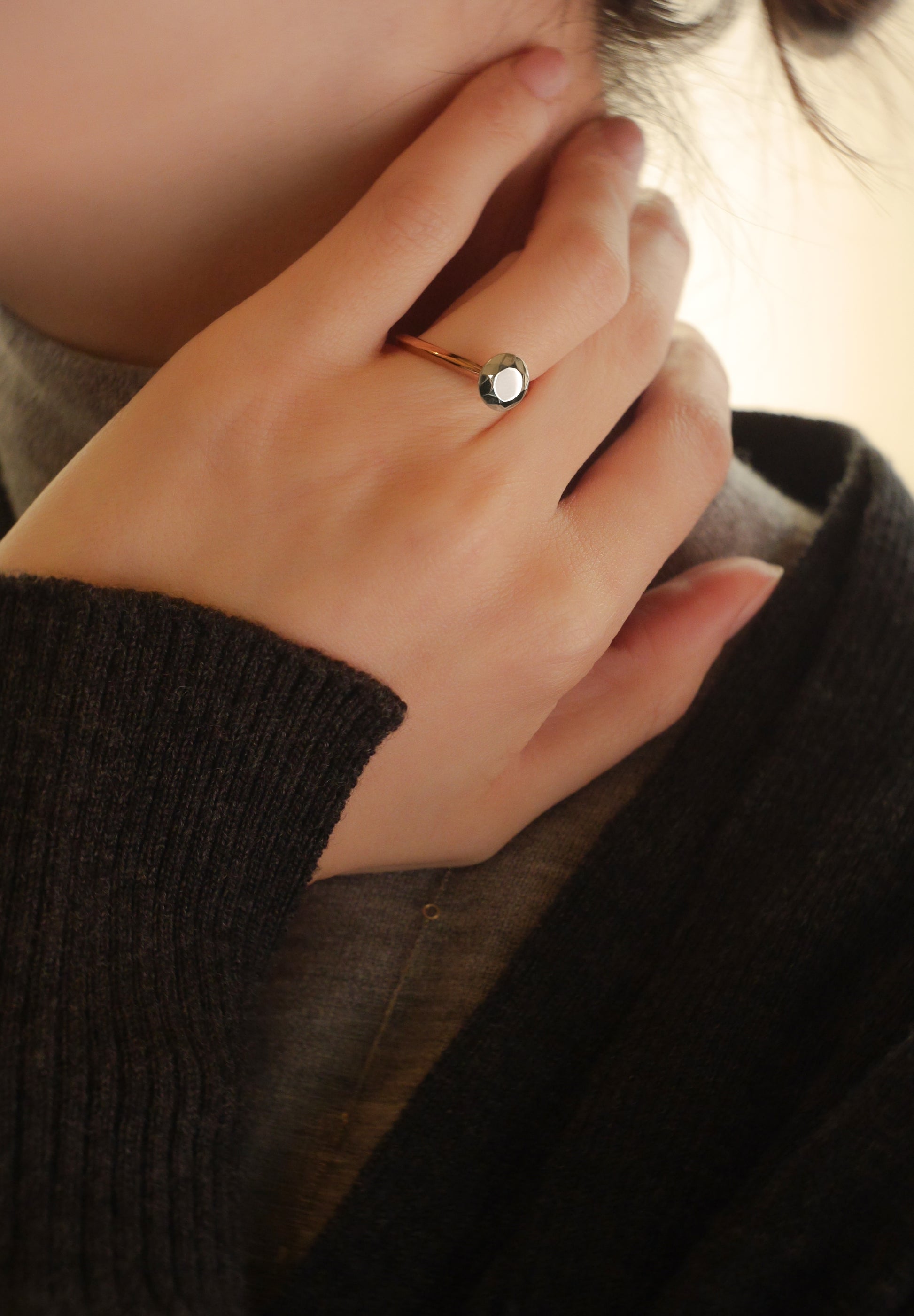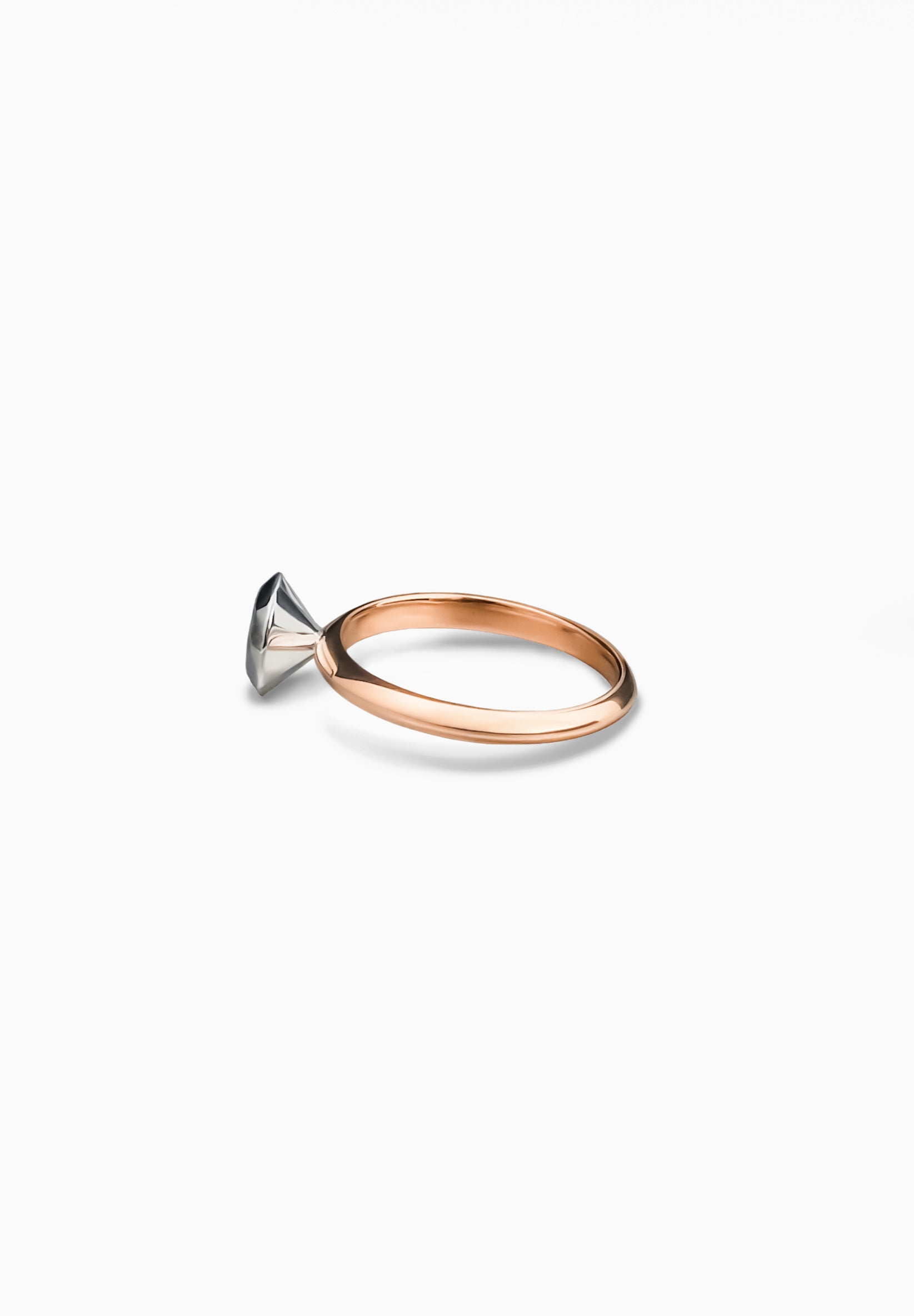 18캐럿 옐로우 골드+플래티넘 900 패싯 링. 모더니스트 건축가 루이스 칸(Louis Kahn)의 “모든 물질은 빛이 다 타버린 뒤에 남는 것”이라는 말을 바탕으로 디자인되었습니다. 다이아몬드 반지를 모방한 궁극적인 미니멀리스트 모던 접근 방식입니다. 약혼반지로도 딱 맞습니다. *다이아몬드 모양의 상단 직경은 약 6.9mm입니다. 약 1.2캐럿의 다이아몬드 크기에 해당합니다.