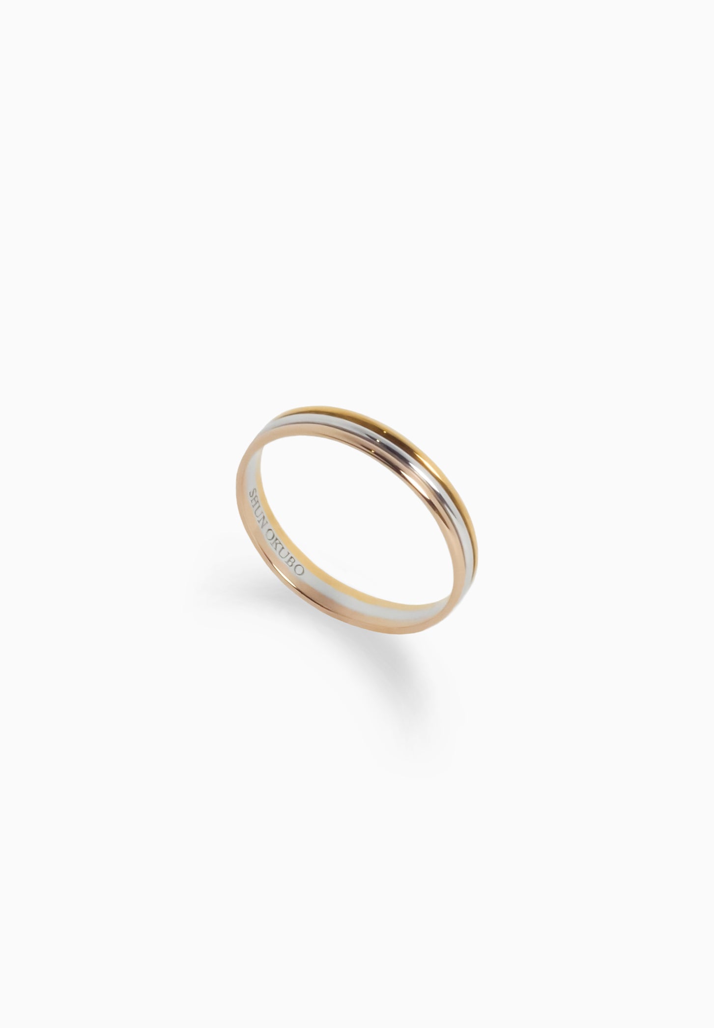 반지는 K18 옐로우 골드, 핑크 골드, 플래티늄 등 6개 부분으로 나누어져 있으며, 이는 SHUN OKUBO의 보석 장인. 세 가지 다른 금속." 조화를 표현합니다.