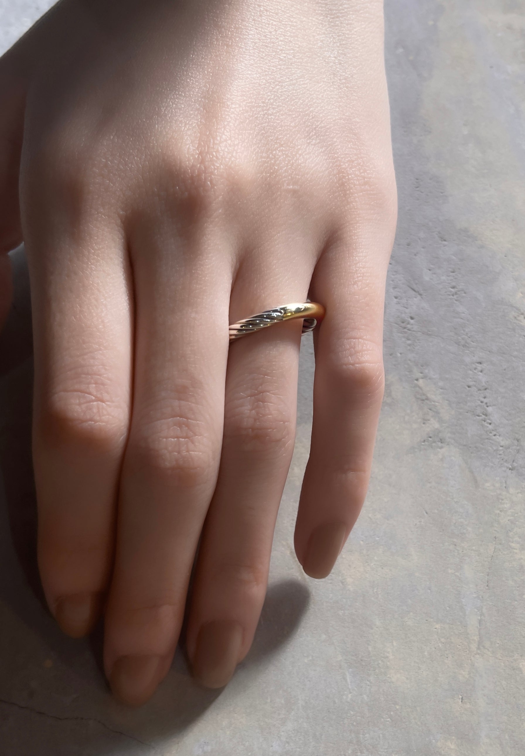 트위스트된 스털링 실버 와이어로 제작된 링과 미러링된 18캐럿 옐로우 골드 링. 소재와 디테일의 대비가 인상적입니다. 트위스트된 부분의 장식성은 미니멀하면서도 엄숙한 느낌을 주며, 윤기나는 K18 미러 표면이 특징입니다. 화가 카라바조의 그림에서 영감을 받은 반지입니다. 결혼반지나 페어링에도 추천하는 상품입니다.